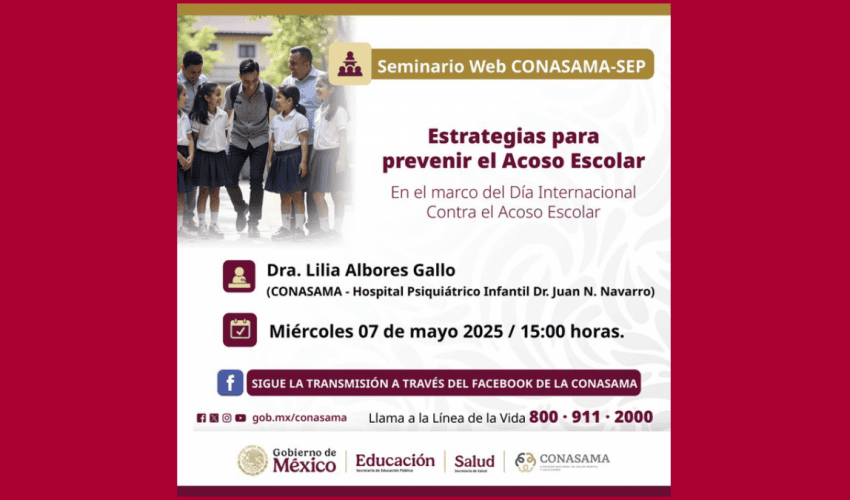 En el marco del Día Internacional contra el Acoso Escolar, te invitamos a la sesión del seminario web CONASAMA-SEP “Estrategias para prevenir el Acoso Escolar”.