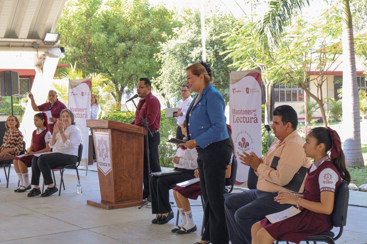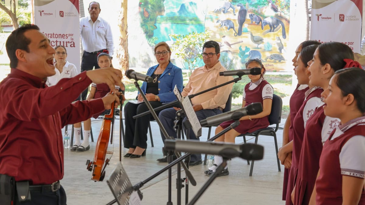 La subsecretaria de Planeación, Sylvia Isabel Martínez Guerra, y la subsecretaria de Educación Básica, Marcela Ramírez Jordán, de la Secretaría de Educación de Tamaulipas, que dirige Miguel Ángel Valdez García, presidieron el Séptimo Maratón por la Lectura, como parte de la Estrategia Nacional de Lectura (ENL) 2024-2030, en la Secundaria Técnica No. 90 de Ciudad Victoria, ante más de 400 asistentes que participaron en lecturas, expresiones artísticas y dinámicas escolares para conmemorar el Día de la Maestra y el Maestro.