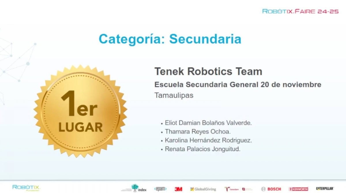 La Escuela Secundaria General No. 2 «20 de noviembre”, de Ciudad Madero, ganó el primer lugar en la Categoría de Secundarias en el Robotix Faire 2024-2025 auspiciado por la Fundación ROBOTIX.