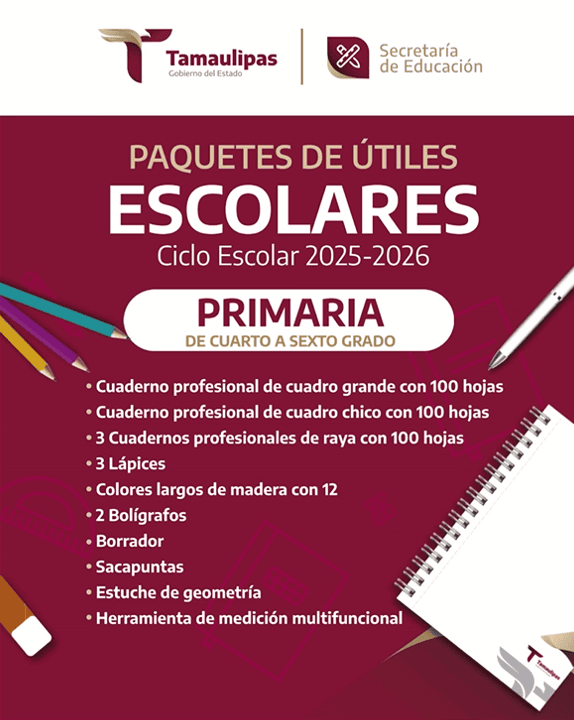 Te presentamos la lista de los útiles escolares que el Gobierno del Estado de Tamaulipas entregará a las niñas, niños y adolescentes de escuelas públicas para el ciclo escolar 2025-2026.