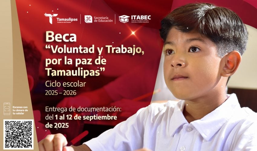 El Gobierno del Estado de Tamaulipas a través de la Secretaría de Educación y el Instituto Tamaulipeco de Becas, Estímulos y Créditos Educativos invita a tramitar la Beca “Voluntad y Trabajo, por la paz de Tamaulipas”, del ciclo escolar 2025-2026.