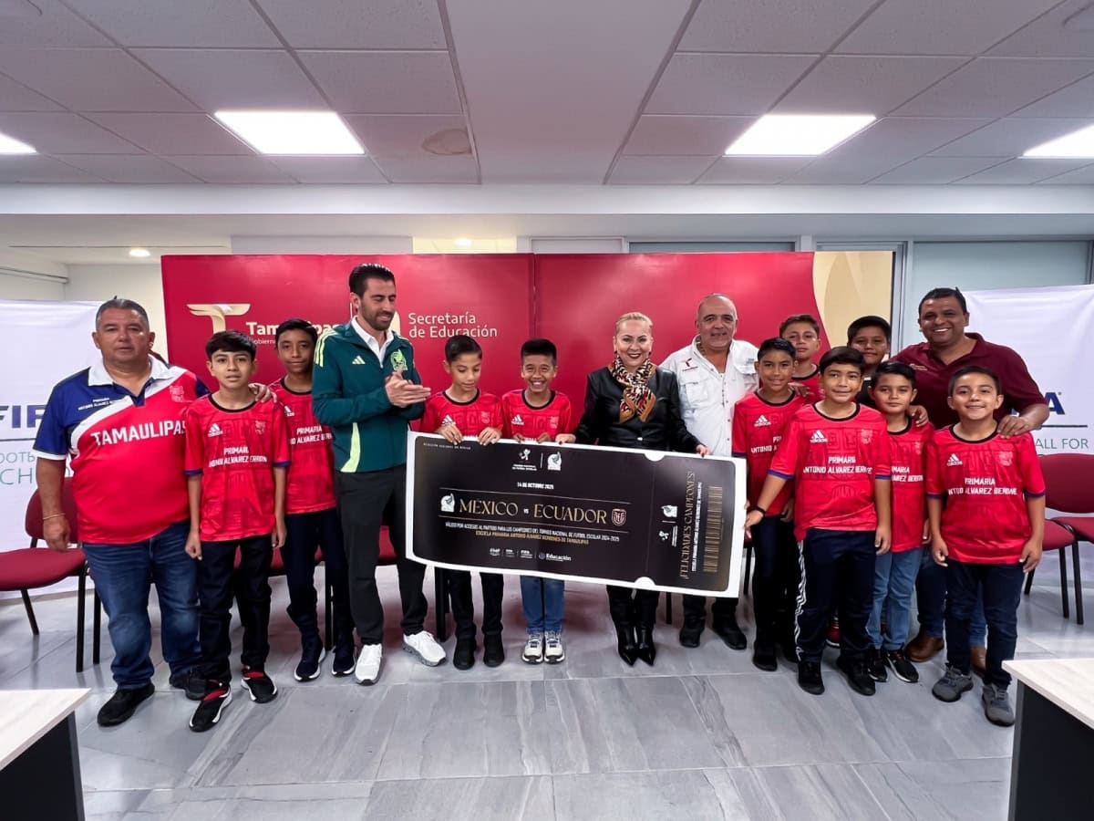La subsecretaria de Educación Básica de la SET, Nora Hilda de los Reyes Vázquez, entregó boletos de avión y apoyo a los estudiantes y a sus profesores que resultaron campeones de la 1a. edición del Torneo Nacional de Futbol Escolar 2024-2025; para que asistan a la convivencia con la Selección Mexicana de Futbol y al juego del 14 de octubre contra Ecuador en Guadalajara, Jalisco.