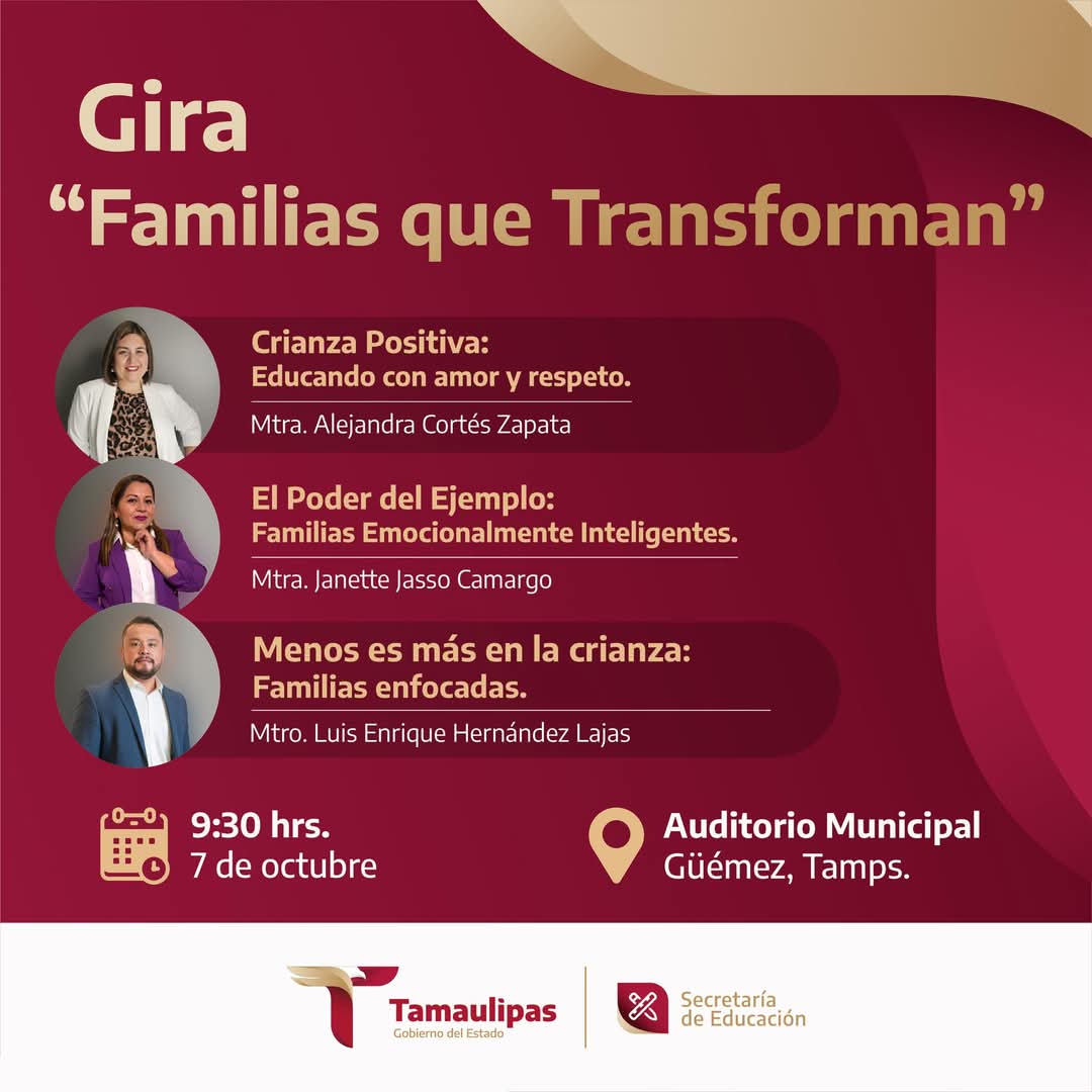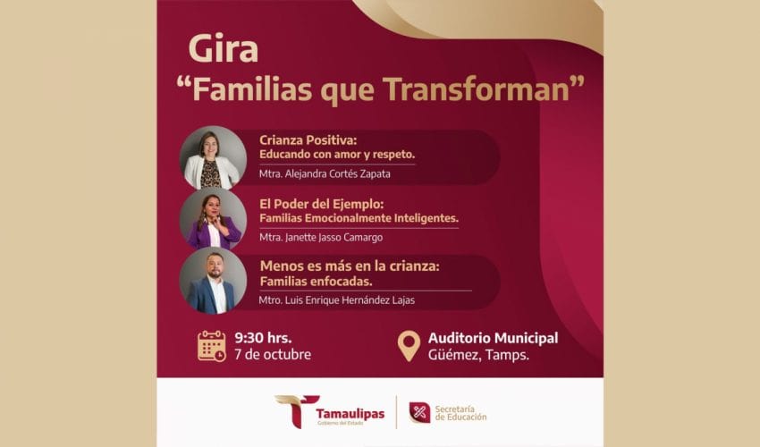 El martes 7 de octubre, a las 9:30 am, se llevará a cabo este ejercicio con la comunidad educativa en el Auditorio Municipal de Güémez, que consistirá en conferencias con los temas ‘Crianza Positiva: Educando con amor y respeto’, impartida por la Mtra. Alejandra Cortés Zapata’; y ‘El Poder del Ejemplo: Familias Emocionalmente Inteligentes’, ofrecida por la Mtra. Janette Jasso Camargo.