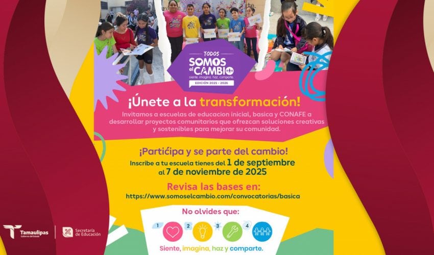 📌La Secretaría de Educación de Tamaulipas, a través de la Subsecretaría de Educación Básica, invita a las escuelas de Educación Básica en todas sus modalidades y a los Servicios Educativos CONAFE, a participar en la Convocatoria “Todos Somos el Cambio” 2025-2026.