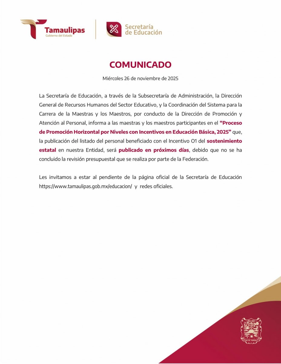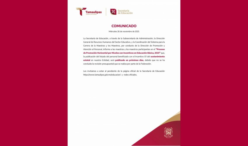 Comunicado de la Secretaría de Educación de Tamaulipas sobre el Proceso de Promoción Horizontal por Niveles con Incentivos en Educación Básica 2025 del listado del personal beneficiado con el Incentivo 01 del sostenimiento estatal.