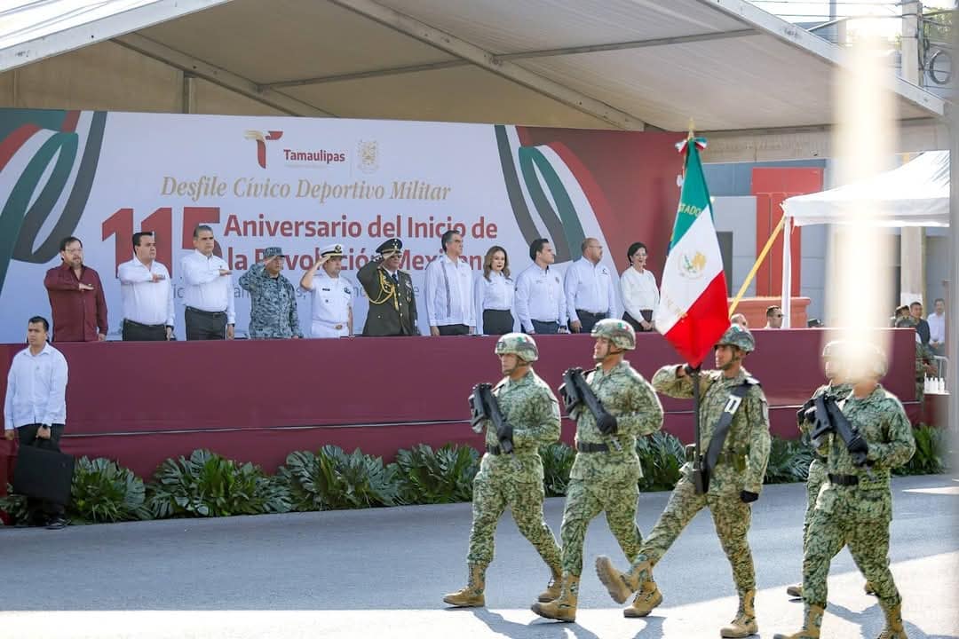 El titular de la Secretaría de Educación, Miguel Ángel Valdez García, compartió la línea de honor del desfile cívico-militar conmemorativo del 115 Aniversario de la Revolución Mexicana, acompañando al gobernador del Estado, Américo Villarreal Anaya, en Ciudad Victoria.