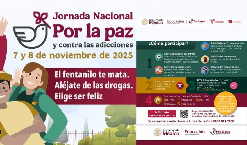 La Secretaría de Educación Pública, y la Secretaría de Educación de Tamaulipas, invitan a la ‘Jornada Nacional por la Paz y contra las Adicciones’, los días 7 y 8 de noviembre de 2025.