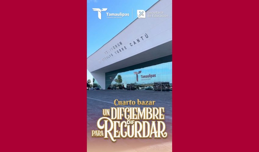 La Secretaría de Educación de Tamaulipas invita al cuarto bazar navideño “Un diciembre para recordar”, que organiza el sistema DIF Tamaulipas, que preside la Dra. María de Villarreal, para que asisten y apoyen esta iniciativa que reúne a más de 150 expositores en el Polyforum Victoria, del 12 al 15 de diciembre, de 11:00 am a 7:00 pm.