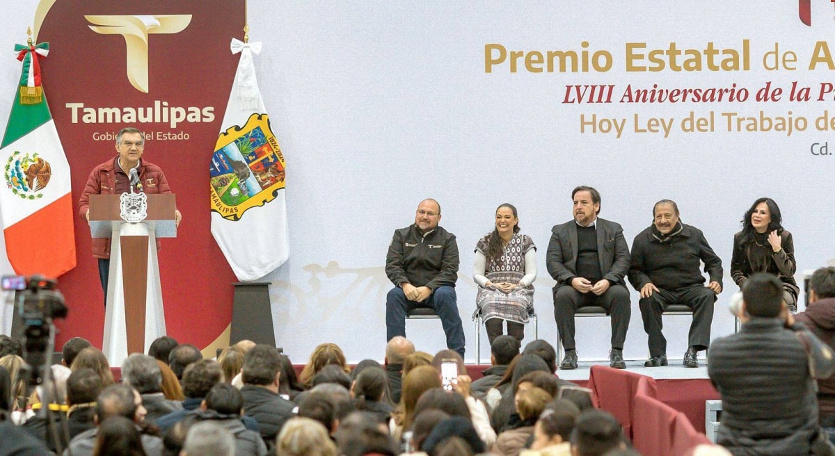 El secretario de Educación de Tamaulipas, Miguel Ángel Valdez García, participó en la ceremonia de entrega del Premio Estatal de Antigüedad en el Servicio Público, presidida por el gobernador Américo Villarreal Anaya, donde se reconoció a servidoras y servidores públicos con trayectorias de entre 20 y 55 años de servicio.