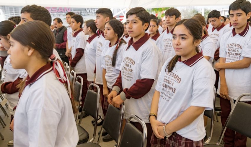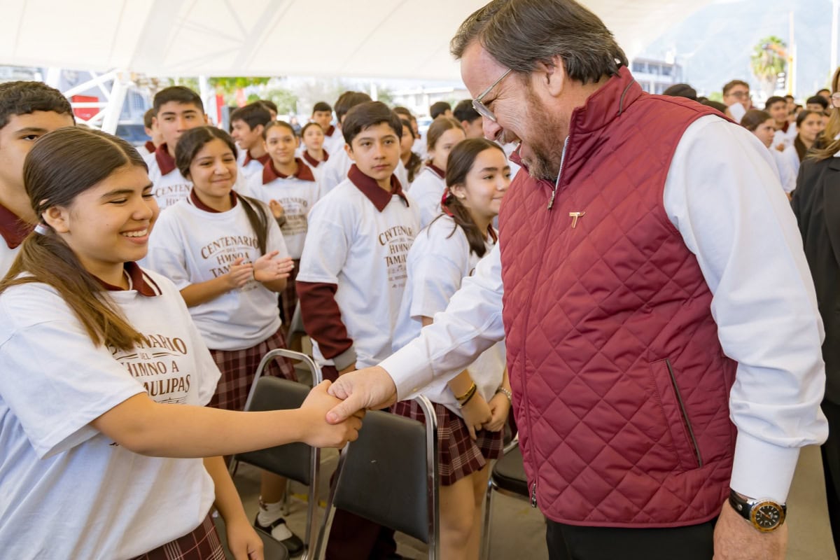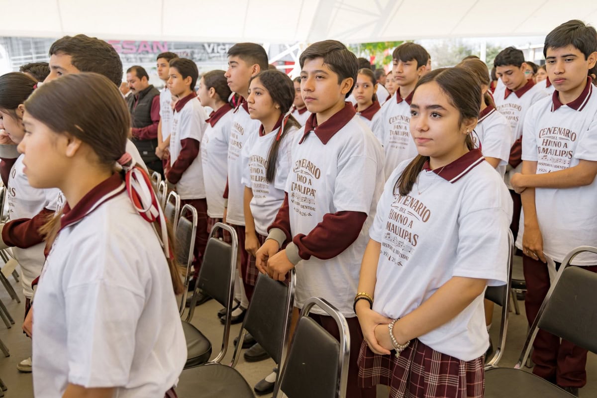 En el marco del ‘Centenario del Himno a Tamaulipas: Voz, Historia e Identidad’, el secretario de Educación de Tamaulipas, Miguel Ángel Valdez García, presidió la conmemoración realizada en el Patinadero de la Unidad Deportiva “Adolfo Ruiz Cortines”, en Ciudad Victoria, con la participación de 550 asistentes entre autoridades, docentes, alumnas, alumnos y madres y padres de familia.