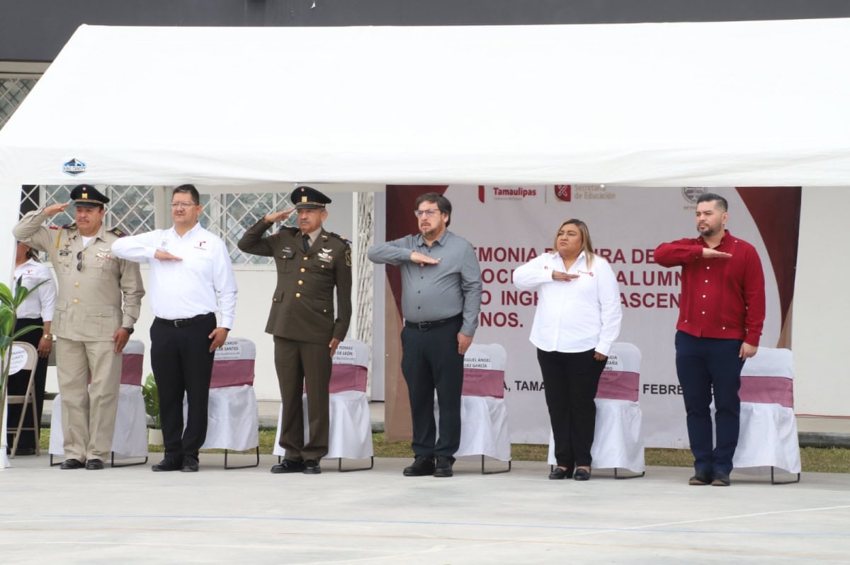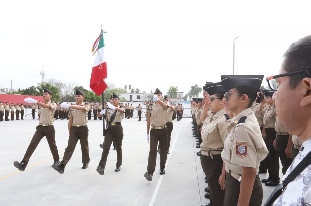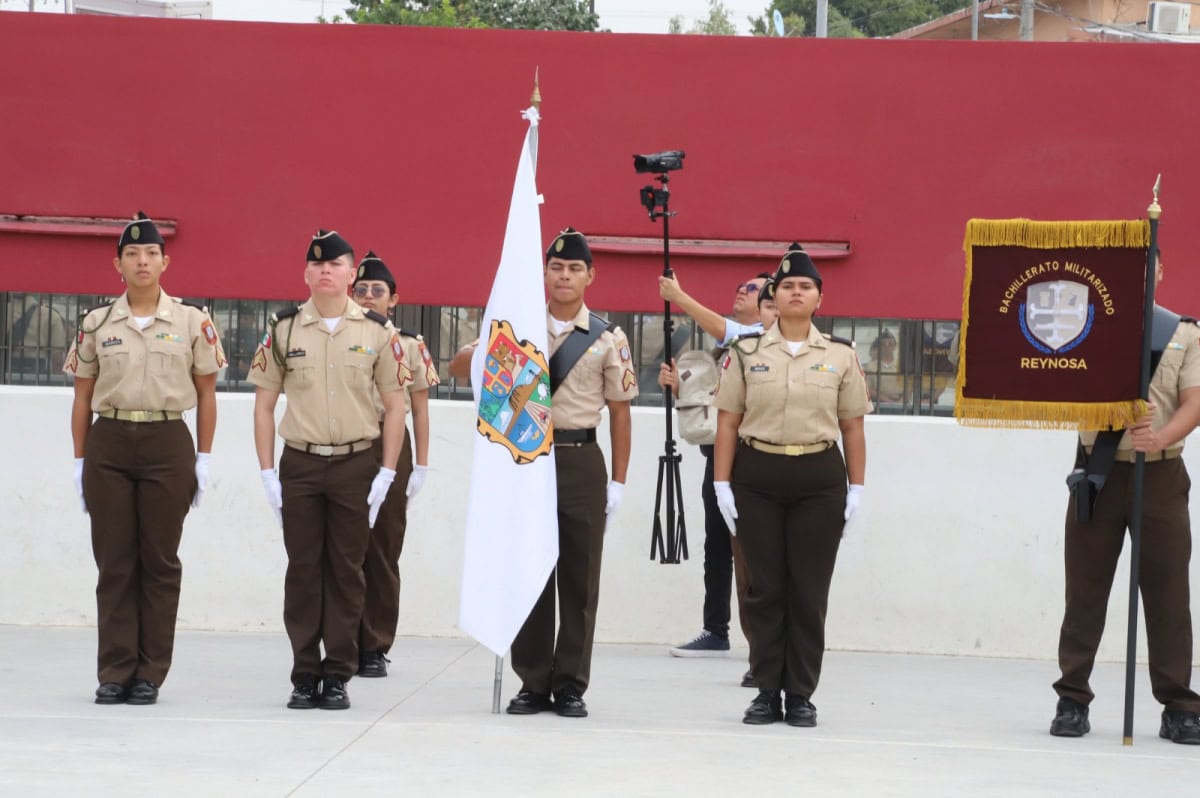 Se llevó a cabo la Ceremonia de Jura de Bandera de Docentes y Alumnos de Nuevo Ingreso y Ascensos de Alumnos en el Bachillerato Militarizado de Reynosa, presidida por el secretario de Educación, Miguel Ángel Valdez García, acompañado de autoridades educativas, directivos del plantel y autoridades militares.