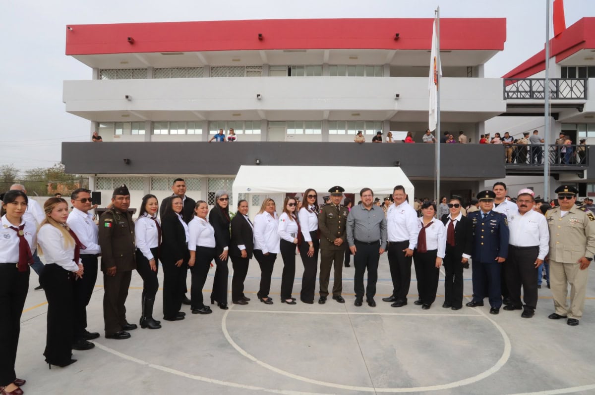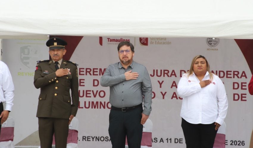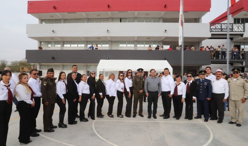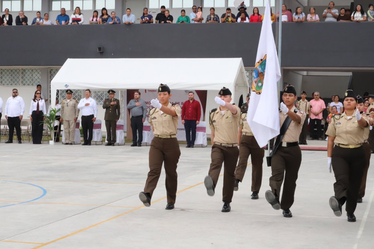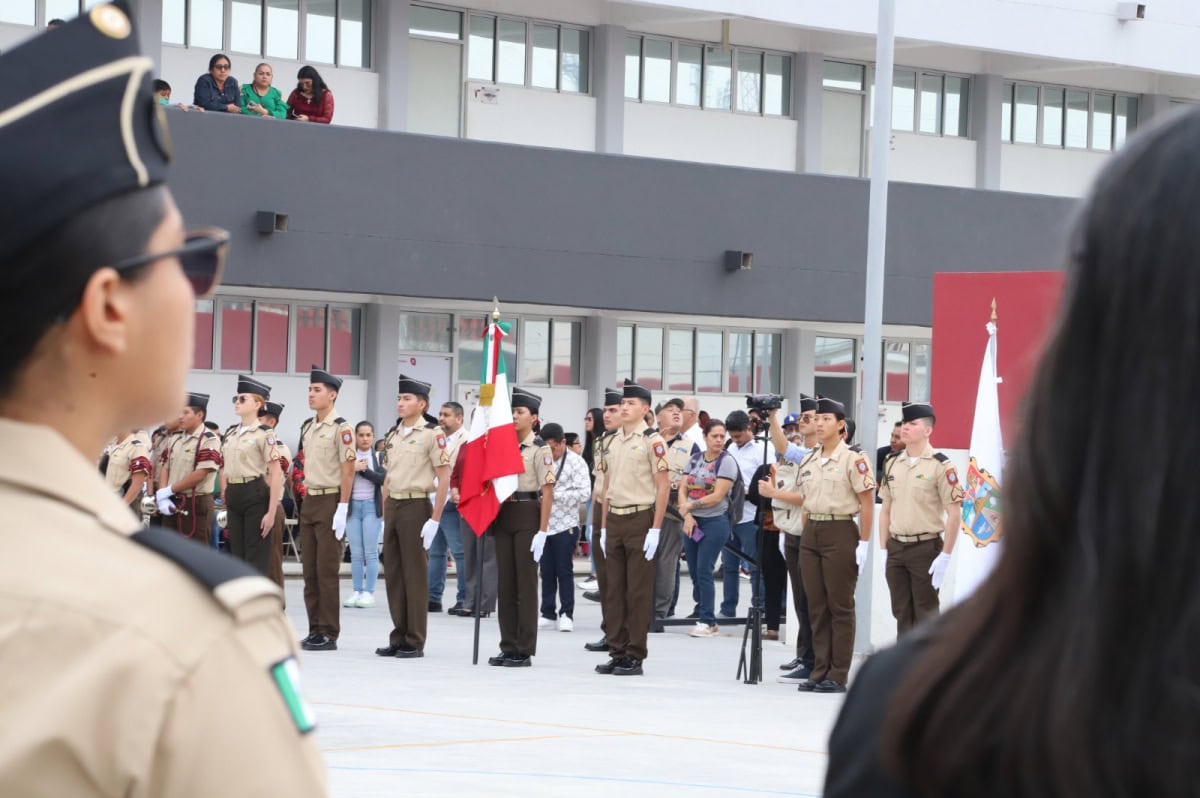 Se llevó a cabo la Ceremonia de Jura de Bandera de Docentes y Alumnos de Nuevo Ingreso y Ascensos de Alumnos en el Bachillerato Militarizado de Reynosa, presidida por el secretario de Educación, Miguel Ángel Valdez García, acompañado de autoridades educativas, directivos del plantel y autoridades militares.