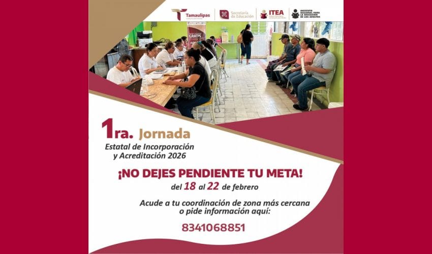 El Instituto Tamaulipeco de Educación para Adultos invita a personas de 15 años o más, a participar en la Primera Jornada Estatal de Incorporación y Acreditación 2026, para certificar sus estudios de primaria y/o secundaria.