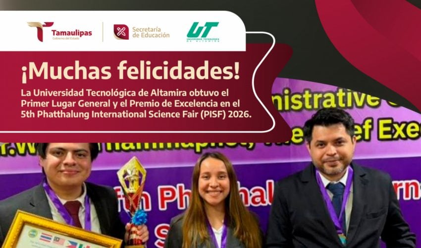 Nuestro reconocimiento a la Universidad Tecnológica de Altamira por su éxito al obtener el Primer Lugar General y el Premio de Excelencia en el 5th Phatthalung International Science Fair (PISF) 2026, celebrado en Tailandia.