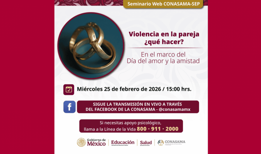 En el marco del Día del Amor y la Amistad, se invita al Seminario Web CONASAMA-SEP “Violencia en la pareja ¿qué hacer?”