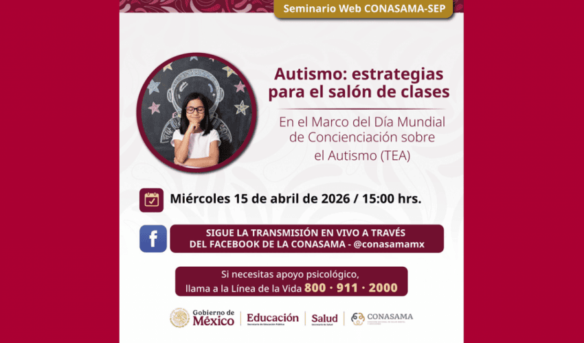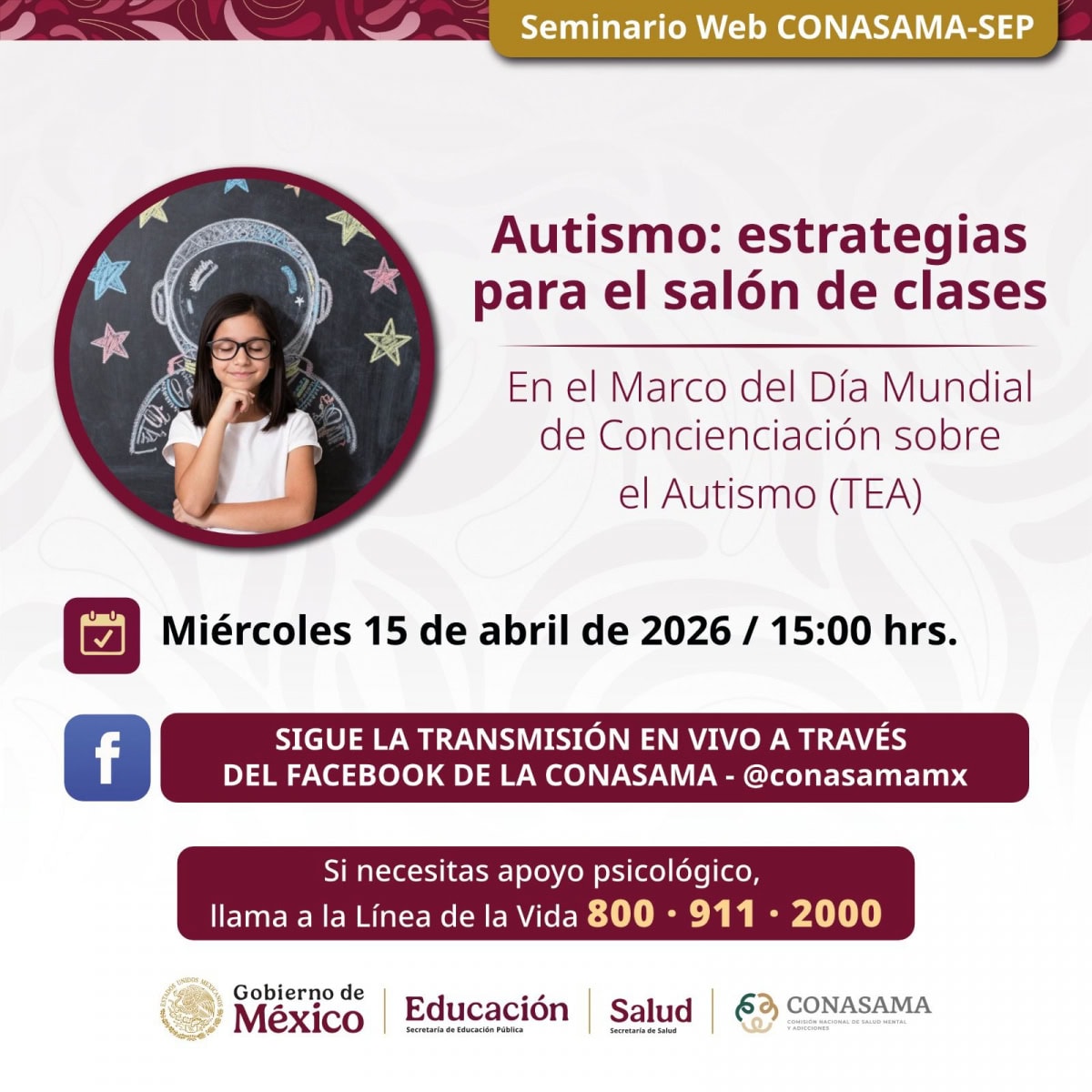 Se invita al Seminario Web Comisión Nacional de Salud Mental y Adicciones (CONASAMA)- Secretaría de Educación Pública (SEP), en el marco del Día Mundial de Concienciación sobre el Autismo (TEA), a la siguiente ponencia: