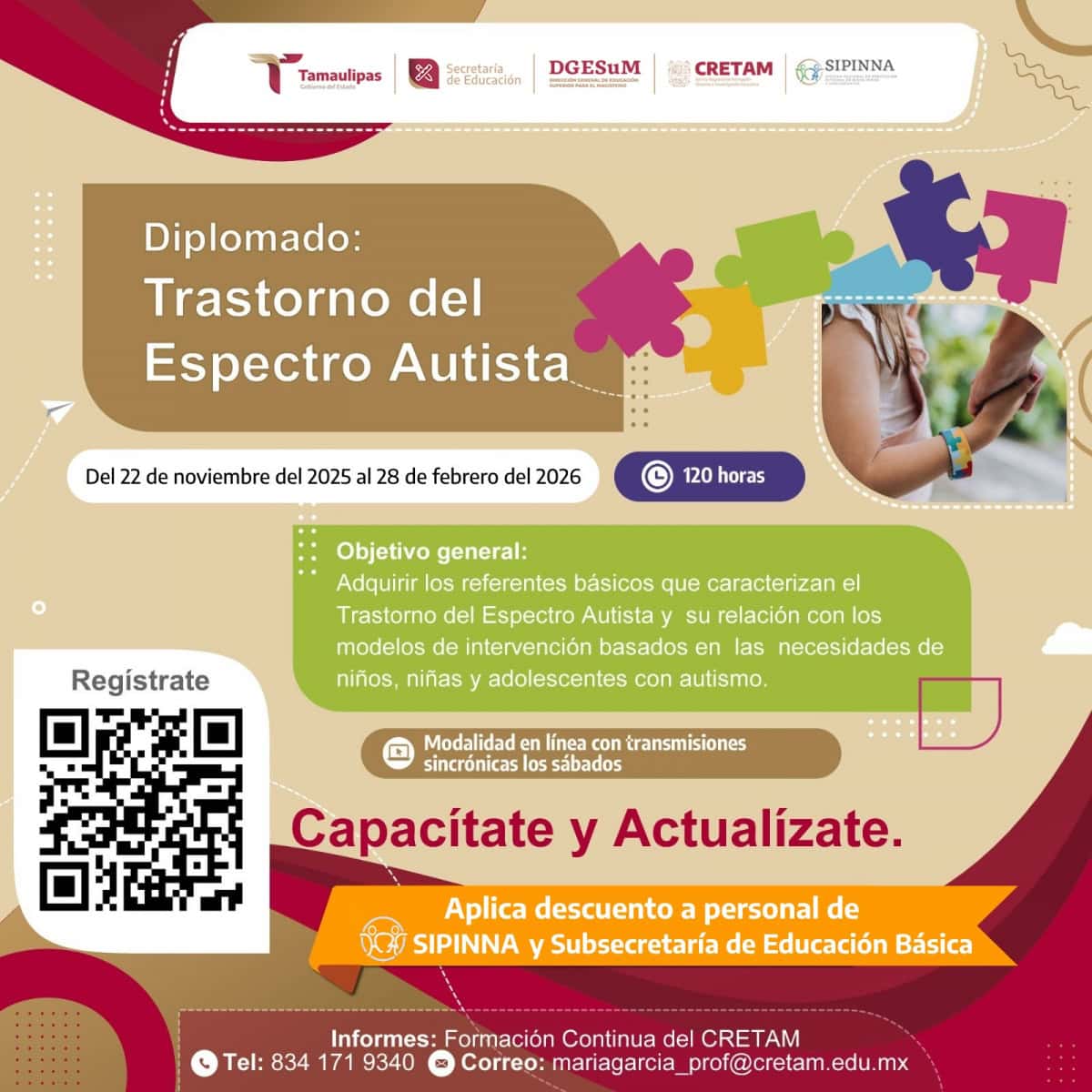El Centro Regional de Formación Docente e Investigación Educativa(CRETAM) anuncia el lanzamiento de su Diplomado en Trastorno del Espectro Autista (TEA), dirigido a profesionales de la salud, la educación y otras áreas de intervención que busquen profundizar en el manejo y la atención integral a personas con TEA.