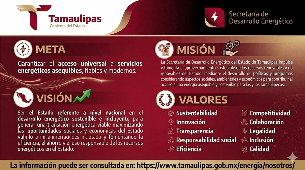 La Secretaría de Desarrollo Energético del Estado de Tamaulipas impulsa y fomenta el aprovechamiento sostenible de los recursos renovables y no renovables del Estado, mediante el desarrollo de políticas y programas considerando aspectos sociales, ambientales y económicos para contribuir al acceso a una energía asequible y sostenible para las y los tamaulipecos.