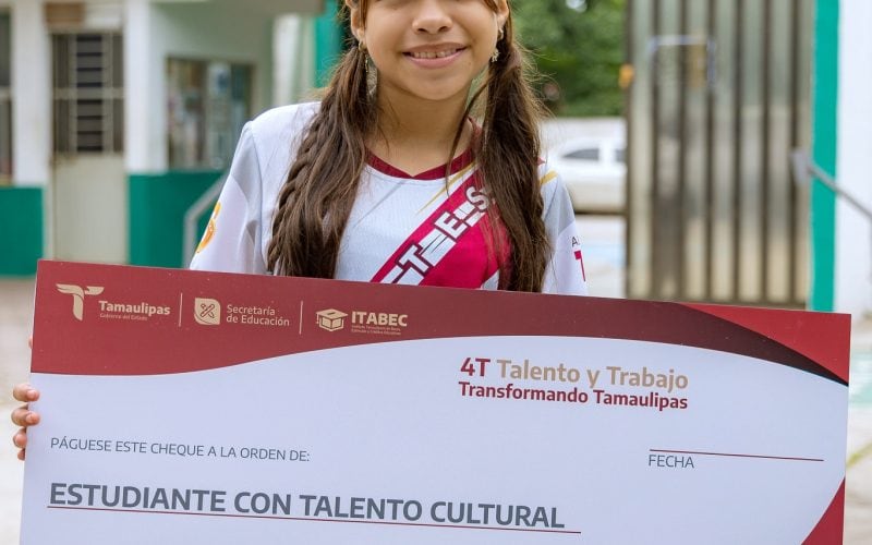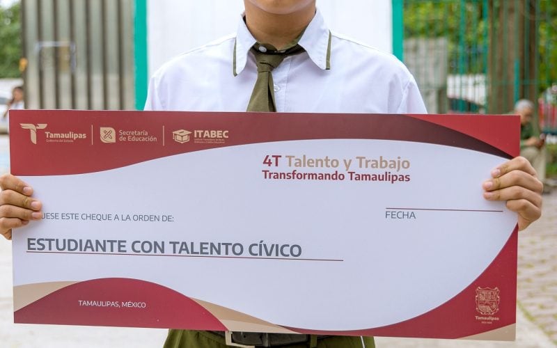 En representación del gobernador de Tamaulipas, Américo Villarreal Anaya, la titular de la Secretaría de Educación en el estado, Lucía Aimé Castillo Pastor, hizo entrega, por primera vez, de los cheques del programa «4T Talento y Trabajo Transformando Tamaulipas» a estudiantes con talento académico, deportivo, cultural, cívico o emprendedor que hayan obtenido un reconocimiento dentro de los tres primeros lugares a nivel estatal, regional, nacional o internacional.