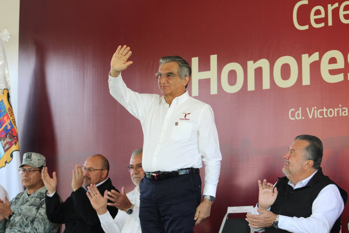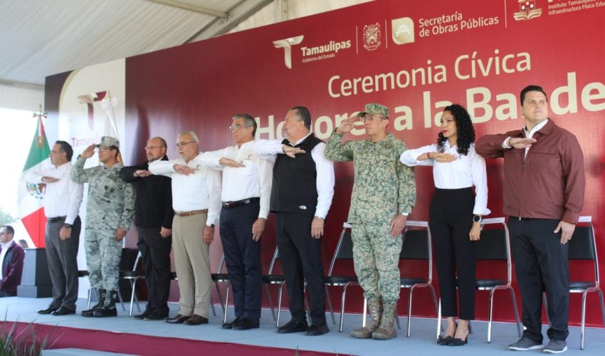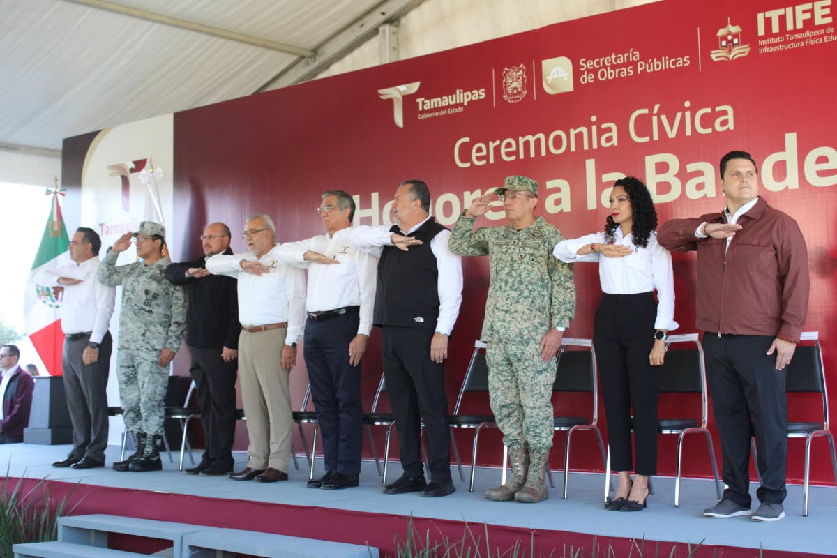 Este lunes, durante la ceremonia de honores a la bandera nacional encabezada por el gobernador del Estado, Américo Villarreal Anaya, estuvieron presentes el secretario de Obras Públicas, Pedro Cepeda Anaya, y el director general del Instituto Tamaulipeco de Infraestructura Física Educativa (ITIFE), Sergio O. Castillo Sagástegui.