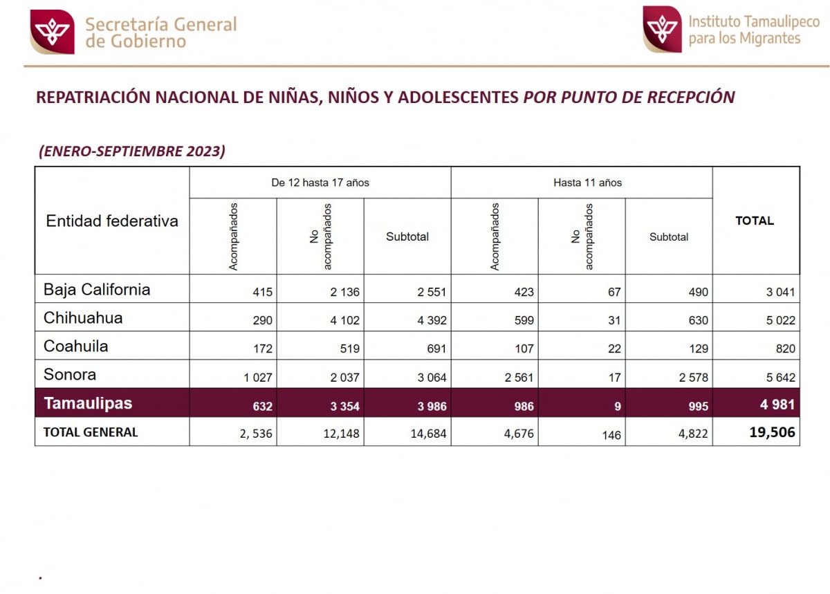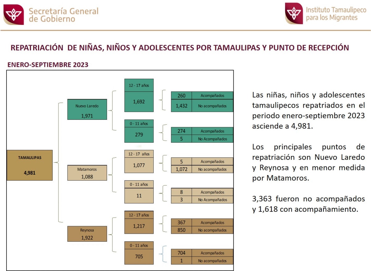 Repatriación de Niñas, Niños y Adolescentes por Tamaulipas y punto de recepción (Enero-Septiembre 2023).