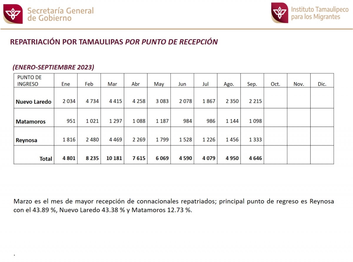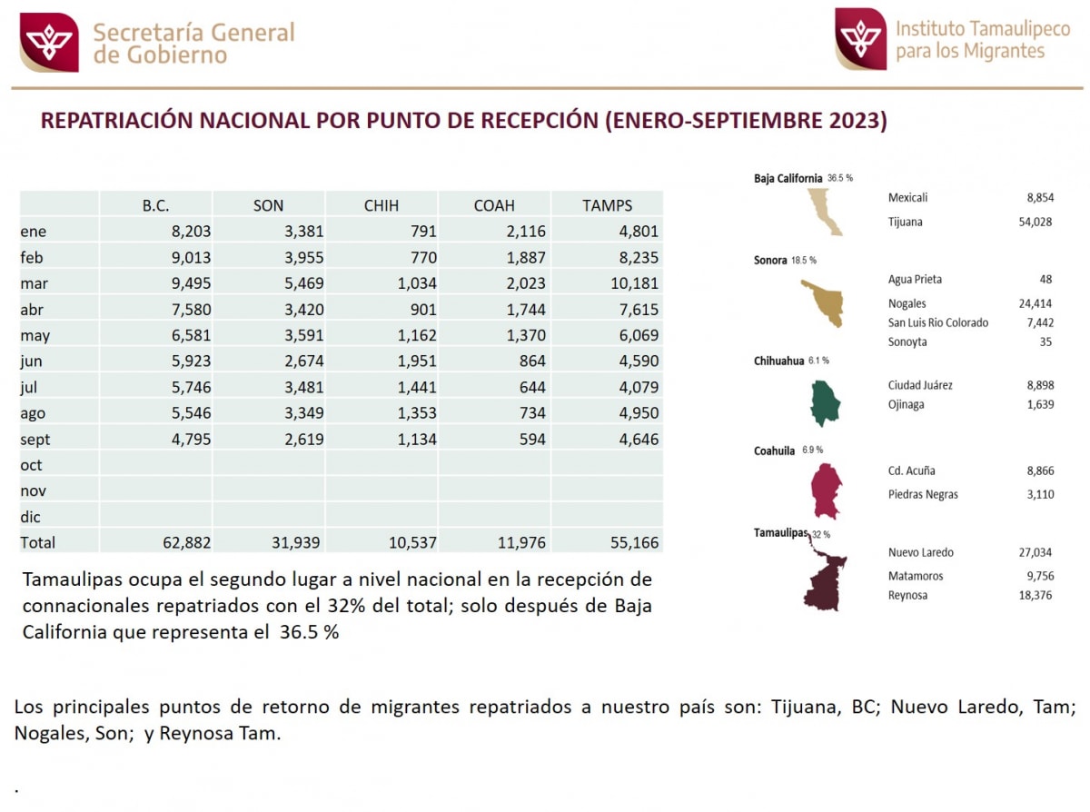 Repatriación por Tamaulipas por puntos de recepción (Enero-Septiembre 2023).