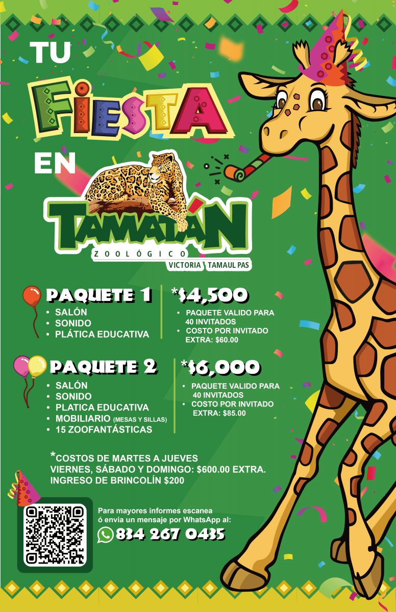 Paquete N° 1Salón: El salón de fiestas del Zoológico Tamatán es un espacio cerrado que cuenta con un escenario, lugar para mesas y sillas para tus invitados, área de piñata, clima controlado y capacidad para 200 invitados. ¡Es el lugar perfecto para celebrar tu evento especial rodeado de la naturaleza y la vida silvestre! Sonido: En tu fiesta, podrás disfrutar de un ambiente musical increíble gracias a nuestro servicio de sonido. Además, contamos con micrófonos para tus anuncios y presentaciones. ¡No te preocupes por la música, ya que en toda la fiesta habrá un fondo musical que hará que todos se diviertan al máximo! Platica educativa: El Departamento de Educación Ambiental y el Zoológico Infantil llevarán a cabo una plática educativa en la que se presentarán 5 especies diferentes entre aves, reptiles y pequeños mamíferos. Durante la plática, los invitados (niños y adultos) tendrán la oportunidad de interactuar con las especies y hacer preguntas sobre ellas. Al final de la plática, los invitados podrán tocar o cargar las especies, siguiendo las instrucciones del personal, y tomar fotos con ellas sin usar el flash. ¡Es una gran oportunidad para aprender y divertirse al mismo tiempo! Costo de martes a jueves: $4500.00 viernes, sábado y domingo: $5100.00