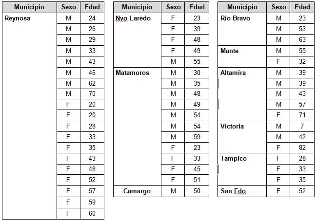 Mientras que las defunciones corresponden a una mujer de 53 años residente de Nuevo Laredo y un paciente masculino de 58 años originario de Altamira.