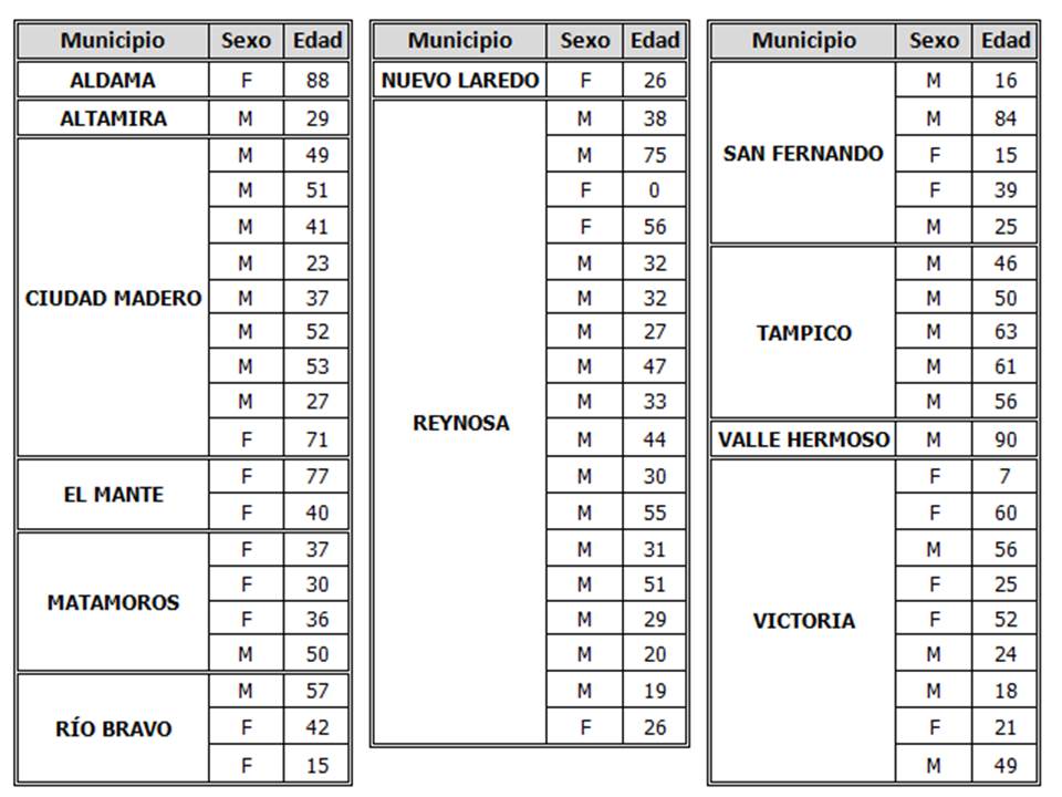 Las defunciones corresponden a un masculino de 55 años residente de Nuevo Laredo con antecedentes de VIH; de Matamoros un hombre de 55 años que padecía diabetes y otro hombre de 50 años con antecedentes de hipertensión arterial; y de Madero una paciente femenina de 79 años de edad con hipertensión arterial sistémica.