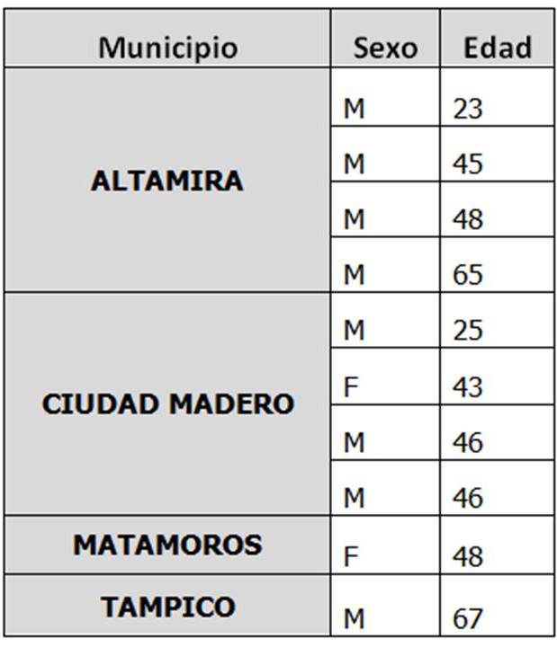 Los fallecimientos, corresponden a un hombre de 67 años residente de Ciudad Madero con antecedentes de diabetes mellitus tipo 2, hipertensión arterial sistémica y enfermedad pulmonar obstructiva crónica; otro hombre de 55 años; originario de Matamoros con hipertensión arterial y diabetes tipo 2 de larga evolución, así como una mujer de 54 años de Reynosa, con antecedente de obesidad mórbida.