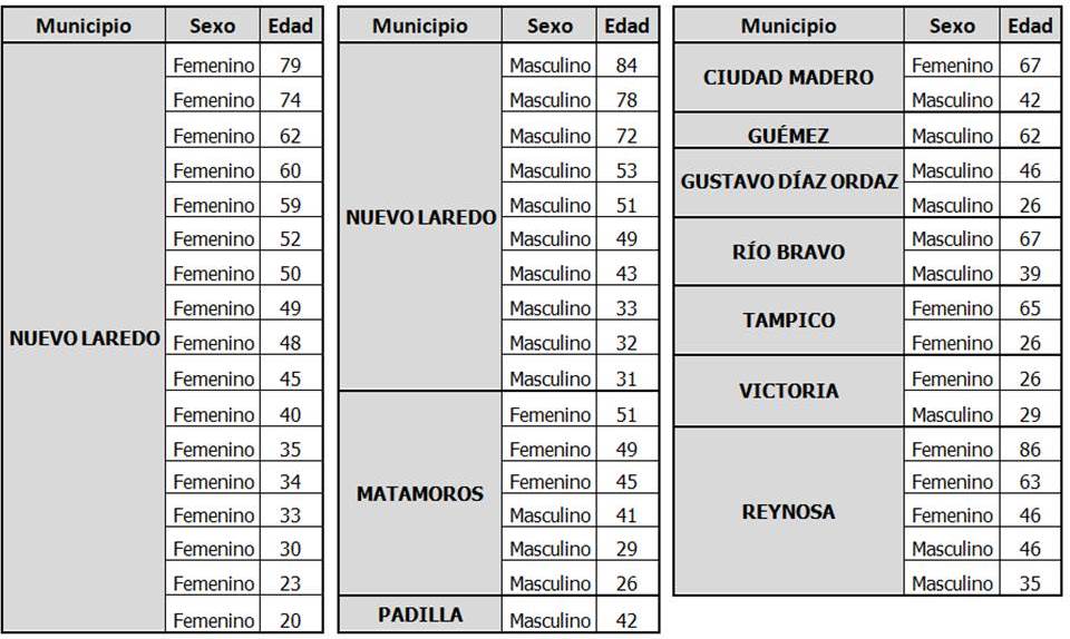 Mientras que las defunciones corresponden a un paciente de 84 años de edad, residente de San Fernando, que sufrió complicaciones asociadas a diabetes mellitus; de Nuevo Laredo, un masculino de 78 años y dos hombres de Tampico, de 53 y 63 años de edad respectivamente.