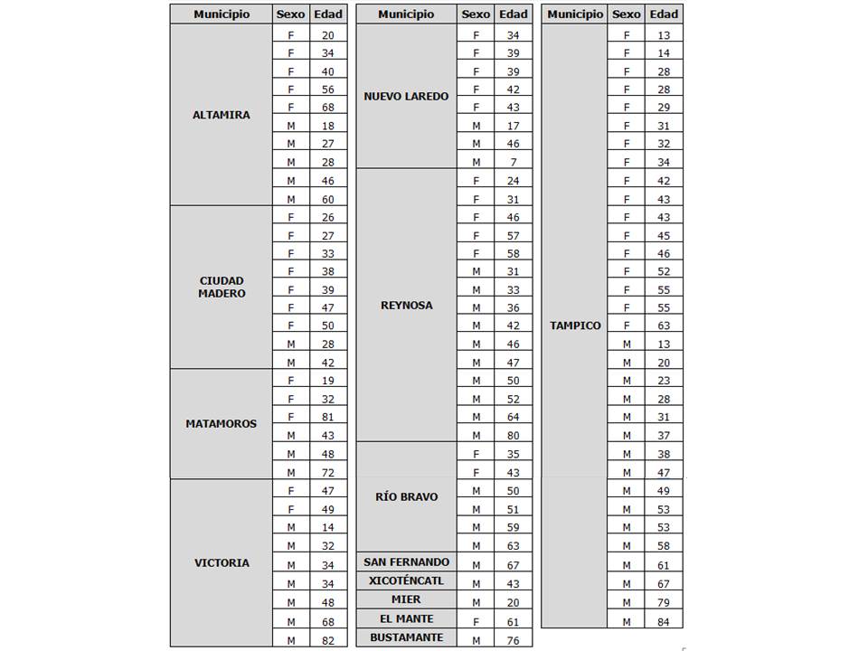 Mientras que las defunciones corresponden a una mujer de 41 años, un hombre de 48 años, un hombre de 57 años, un hombre de 64 años, todos ellos de Reynosa; una mujer de 76 años , un hombre de 61 años, un hombre de 56 años, los tres de Ciudad Victoria.
