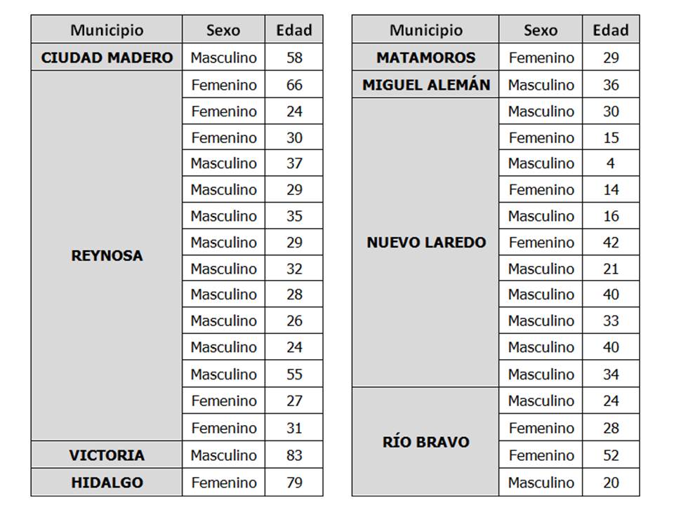 CIUDAD VICTORIA, Tamaulipas.- De las muestras que se encontraban en análisis correspondientes al segundo corte del sábado, 34 resultaron positivas a COVID-19, informó la secretaria de Salud, Gloria Molina Gamboa.