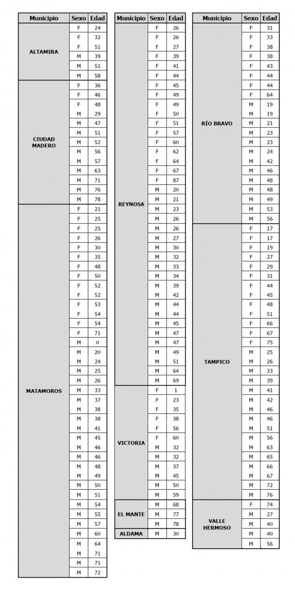 Mientras que los fallecimientos corresponden a una mujer de 59 años y un hombre de 57 años de Reynosa registrados el 20 de junio; una mujer de 57 años de Matamoros y 2 hombres de 87 años de Reynosa y de 32 años de Tampico, del 21 de junio.
