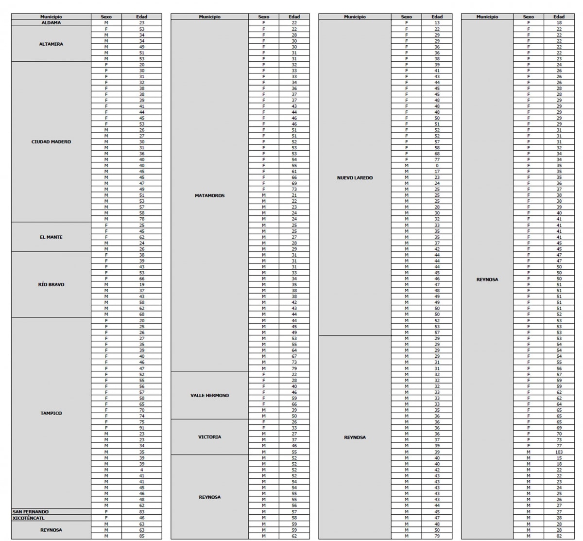 Mientras que las defunciones corresponden a un hombre de 36 años de Reynosa el 21 de junio; un hombre de 57 de Reynosa, el 22 de junio; una mujer de 85 y un hombre de 47 de Reynosa, así como una mujer de 53 de Nuevo Laredo el 25 de junio; un hombre de 73 años de Nuevo Laredo, un hombre de 39 años de Tampico, un hombre de 70 años de Altamira, una mujer de 75 y un hombre de 23 años de Reynosa, el 26 de junio; una mujer de 74 años de Nuevo Laredo, una mujer de 64 años de Matamoros y otra mujer de 44 años de San Fernando el 27 de junio y finalmente un hombre de 49 de Nuevo Laredo y otro de 60 años de Valle Hermoso el 28 de junio.