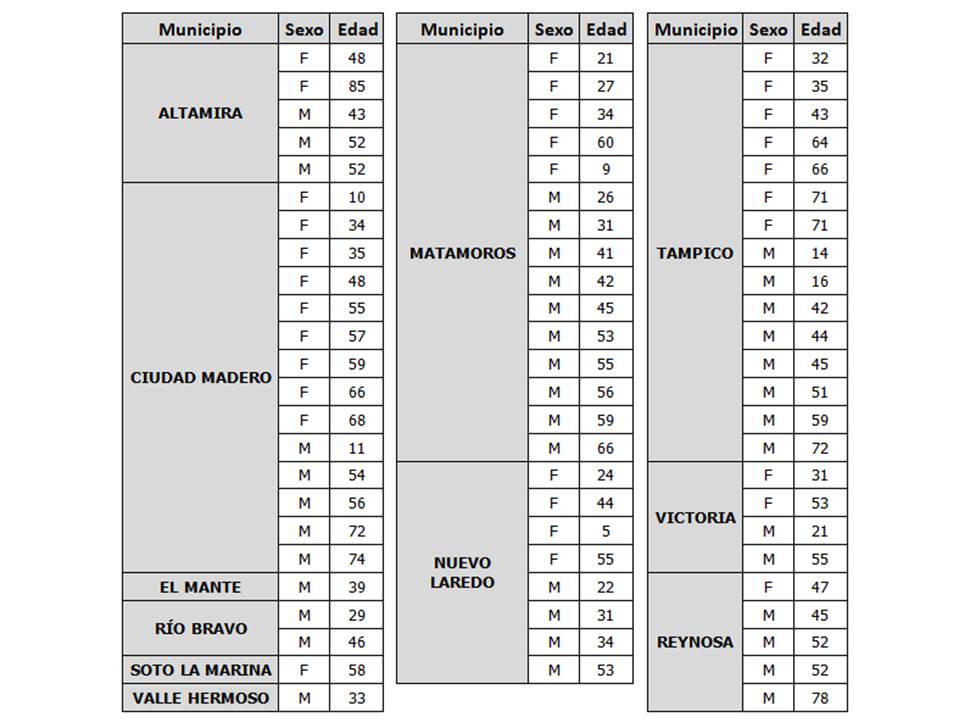 Las defunciones corresponden a 2 mujeres de 26 y 53 años, así como a un hombre de 79 años del municipio de Reynosa; un hombre de 56 años de Matamoros; un hombre y una mujer de 76 y 57 años de edad respectivamente de Madero; una mujer de 43 años de Altamira y una mujer de 74 años de Nuevo Laredo.
