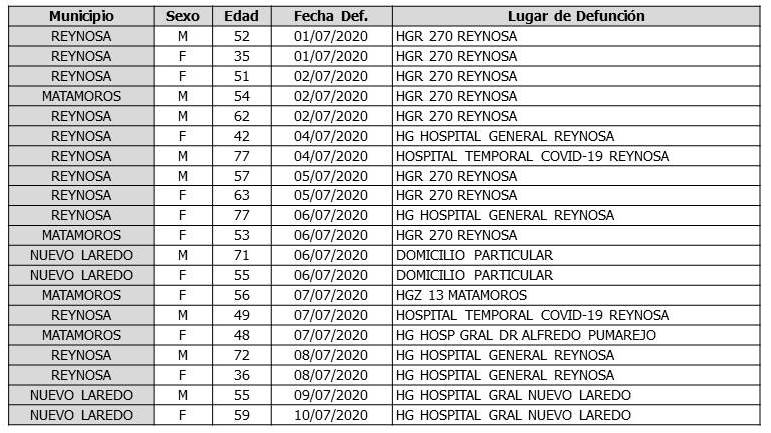 CIUDAD VICTORIA, Tamaulipas.-. En su reporte COVID de este martes, la secretaria de Salud, Gloria Molina Gamboa confirmó 305 casos, 38 del 12 y 267 del 13 de julio, además de 20 nuevas defunciones en Tamaulipas.