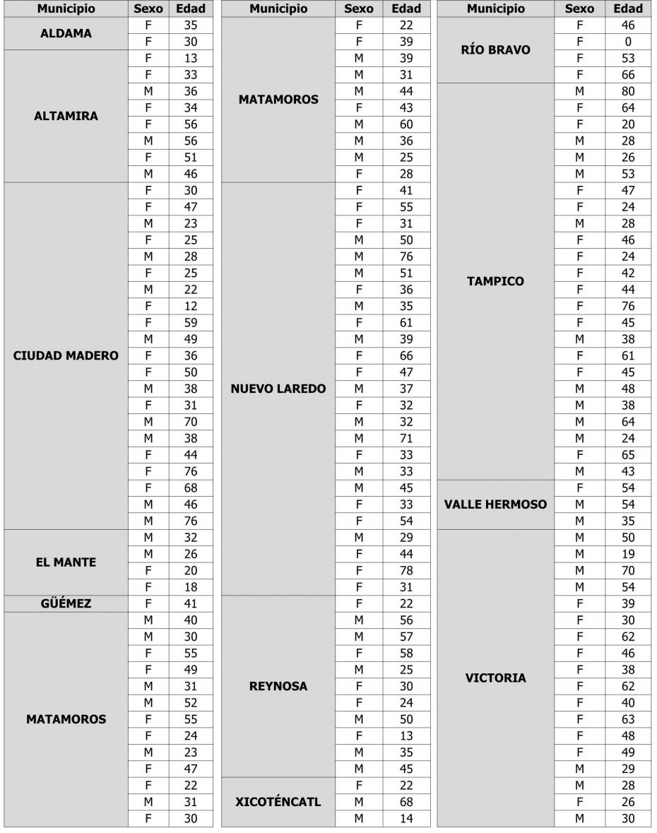 CIUDAD VICTORIA, Tamaulipas.- Durante la jornada de este domingo se confirmaron 147 nuevos casos de COVID-19 y 06 fallecimientos, informó la secretaria de Salud de Tamaulipas, Gloria Molina quien señaló que “todos los días insistiremos en nuestro llamado a la población de protegerse y atender las medidas preventivas como quedarse en casa y el uso del cubrebocas”.