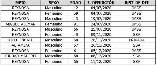 CIUDAD VICTORIA, Tamaulipas.- Durante la jornada de este viernes, Tamaulipas sumó 169 nuevos diagnósticos de COVID-19 y 11 fallecimientos a su conteo oficial, informó la secretaria de Salud, Gloria Molina Gamboa quien reiteró su llamado a quedarse en casa el mayor tiempo posible para disminuir la probabilidad de contagio.