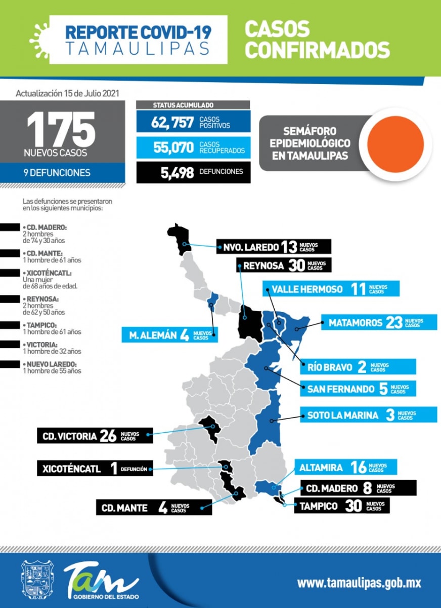 CIUDAD VICTORIA, Tamaulipas.- Tamaulipas sumó este jueves 175 nuevos casos de COVID-19 y 9 fallecimientos a su conteo oficial, informó la secretaria de Salud, Gloria Molina Gamboa luego de insistir en su llamado a extremar las medidas de prevención ya conocidas para evitar un repunte en los contagios, complicaciones graves y fallecimientos.