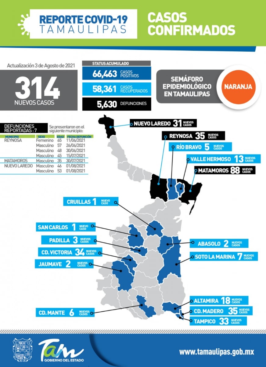 CIUDAD VICTORIA, Tamaulipas.- En su reporte COVID-19 de este martes, la secretaria de Salud de Tamaulipas, Gloria Molina Gamboa confirmó 314 nuevos casos y 7 fallecimientos asociados a complicaciones graves por la enfermedad, por lo que reiteró su llamado a la población a no bajar la guardia y atender en todo momento las seis medidas de seguridad sanitaria para desacelerar la transmisión del virus que son: Uso del cubrebocas, Mantener una distancia mínima de 2 metros con otras personas, Lavado correcto de manos y uso frecuente de alcohol gel, Hacerse la prueba, Aislamiento de casos positivos y Evitar asistir a reuniones sociales.