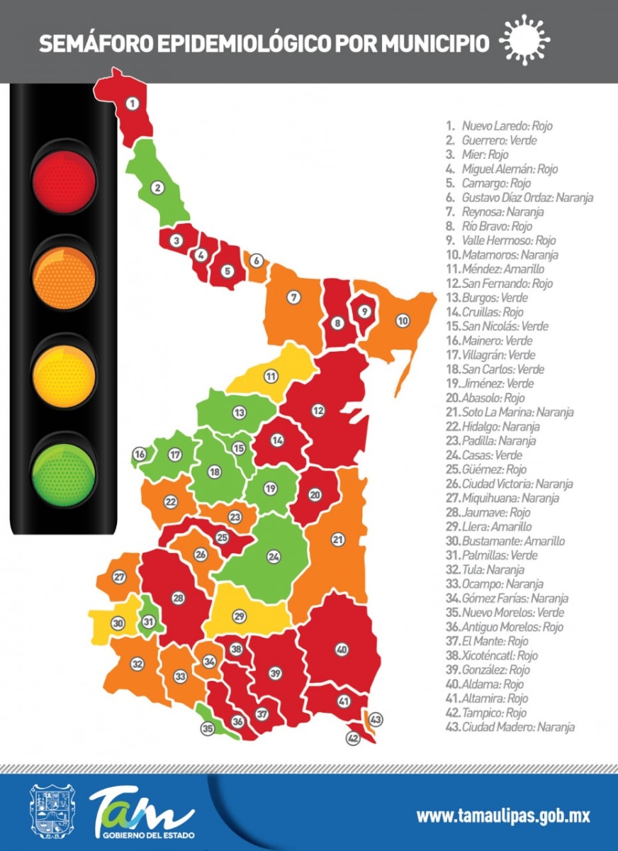La ocupación hospitalaria en Tamaulipas para este día se presenta de la siguiente manera: 39% en los hospitales de la Secretaría de Salud, 16% en el hospital Regional de Alta Especialidad, 58% en los hospitales del IMSS y 23% de ocupación en los hospitales del ISSSTE. Con una ocupación de todo el sector del 44%.
