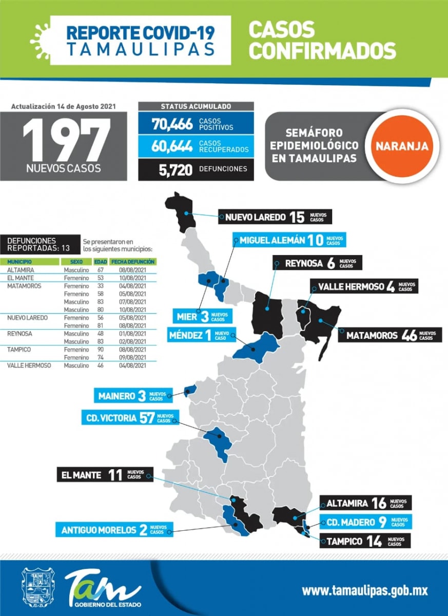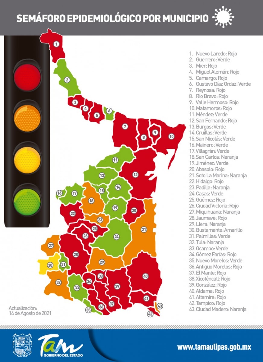Respecto a la ocupación hospitalaria en Tamaulipas para este día se presenta de la siguiente manera: 43% en los hospitales de la Secretaría de Salud, 28% en el hospital Regional de Alta Especialidad, 67% en los hospitales del IMSS y 30% de ocupación en los hospitales del ISSSTE. Con una ocupación de todo el sector del 51%.