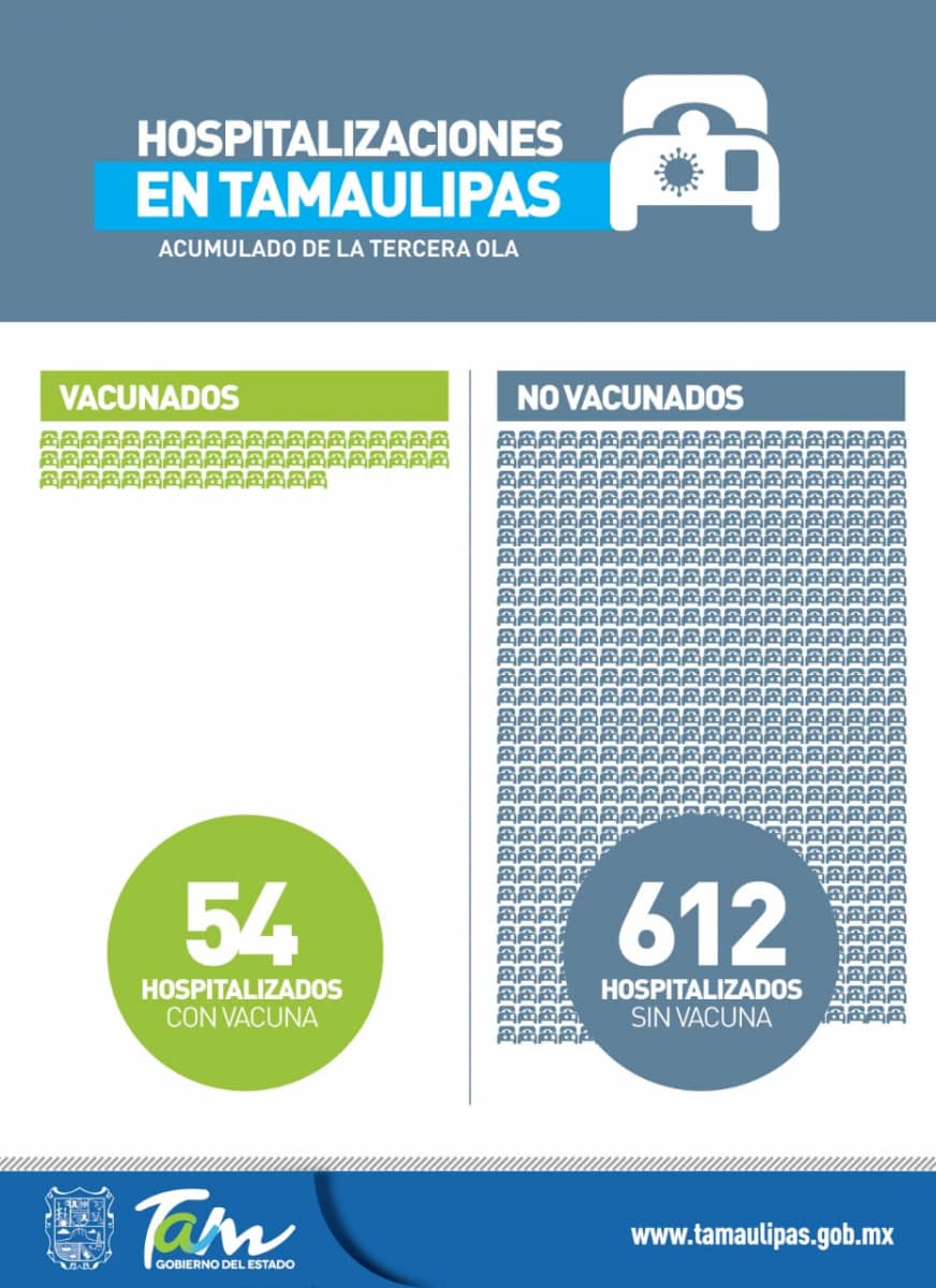 Durante la tercera ola de contagios de COVID-19 en Tamaulipas han sido hospitalizadas 666 personas a causa de esta enfermedad, de las cuales 612 no cuentan con ninguna dosis de la vacuna, de ahí la importancia de acudir a las jornadas de vacunación.