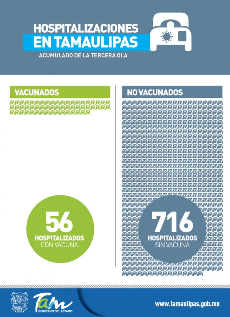 Durante la tercera ola de contagios de COVID-19 en Tamaulipas han sido hospitalizadas 772 personas a causa de esta enfermedad, de las cuales 716 no cuentan con ninguna dosis de la vacuna, de ahí la importancia de acudir a las jornadas de vacunación.