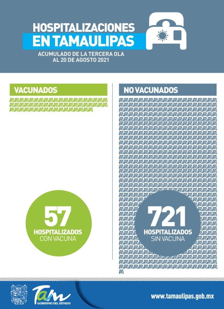 Durante la tercera ola de contagios de COVID-19 en Tamaulipas han sido hospitalizadas 778 personas a causa de esta enfermedad, de las cuales 721 no cuentan con ninguna dosis de la vacuna, de ahí la importancia de acudir a las jornadas de vacunación.
