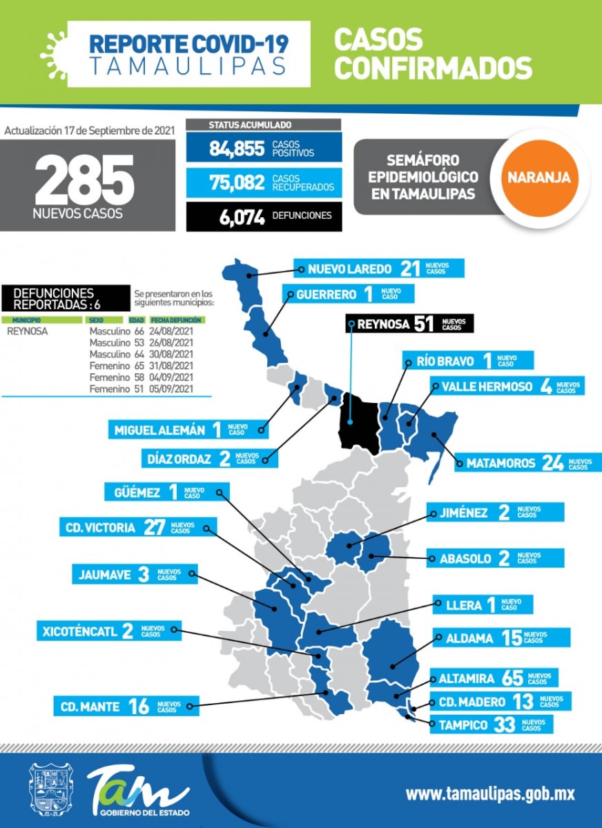 CIUDAD VICTORIA, Tamaulipas. – La pandemia de COVID-19 sumó 285 nuevos casos y 6 fallecimientos por COVID-19, informó hoy la secretaria de Salud, Gloria Molina Gamboa luego de pedir a la población atender las disposiciones emitidas en el nuevo decreto gubernamental para reducir la movilidad, aforos y horarios para continuar haciendo frente a la pandemia y aplanar la curva de contagios.