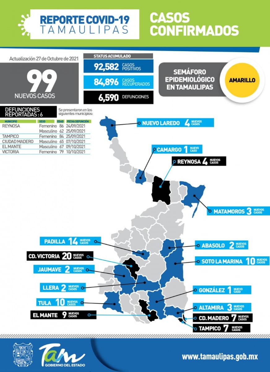 En su reporte diario, la titular de la SST confirmó 99 contagios y 6 fallecimientos, por lo que pidió a las y los tamaulipecos evitar exponer a los más vulnerables, completar su esquema de vacunación anticovid, protegerse y cuidar a sus familias “empezando por nosotros mismos” para seguir avanzando hacia la nueva normalidad.