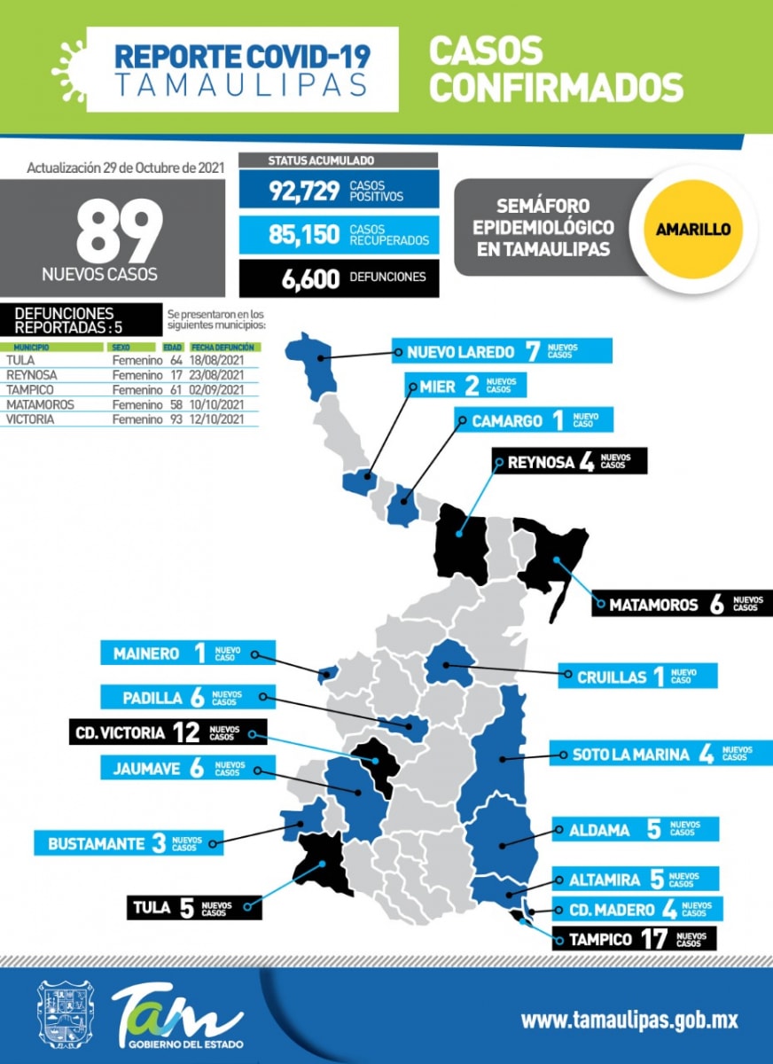 Al presentar el reporte diario sobre el estado de la pandemia, Molina Gamboa confirmó 89 pacientes positivos y 5 defunciones, por lo que exhortó a la población a no bajar la guardia y continuar con las medidas sanitarias básicas como son el uso del cubrebocas, la higiene de manos con agua y jabón o alcohol gel, respetar la sana distancia y evitar salidas no esenciales.