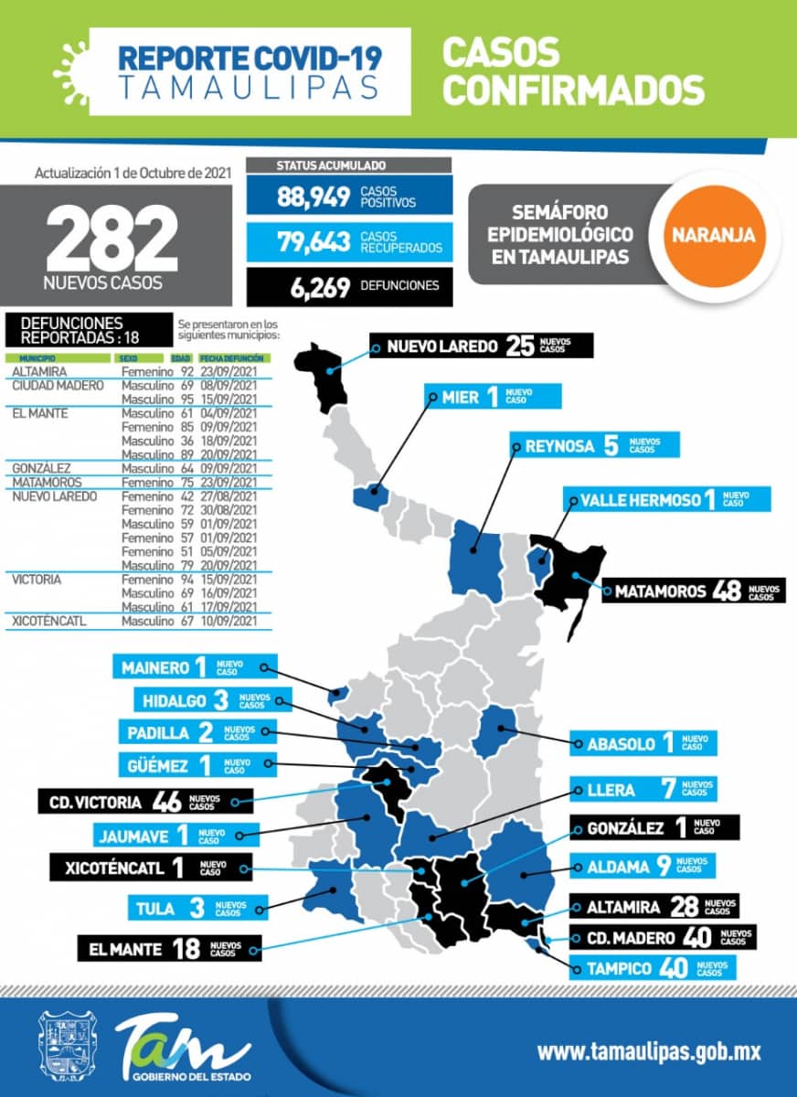 CIUDAD VICTORIA, Tamaulipas . – La pandemia de COVID-19 en Tamaulipas sumó hoy 282 nuevos casos y 19 fallecimientos por complicaciones graves, informó desde esta ciudad capital, la secretaria de Salud, Gloria Molina Gamboa al reiterar su llamado a la población a evitar salidas no esenciales.
